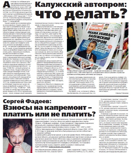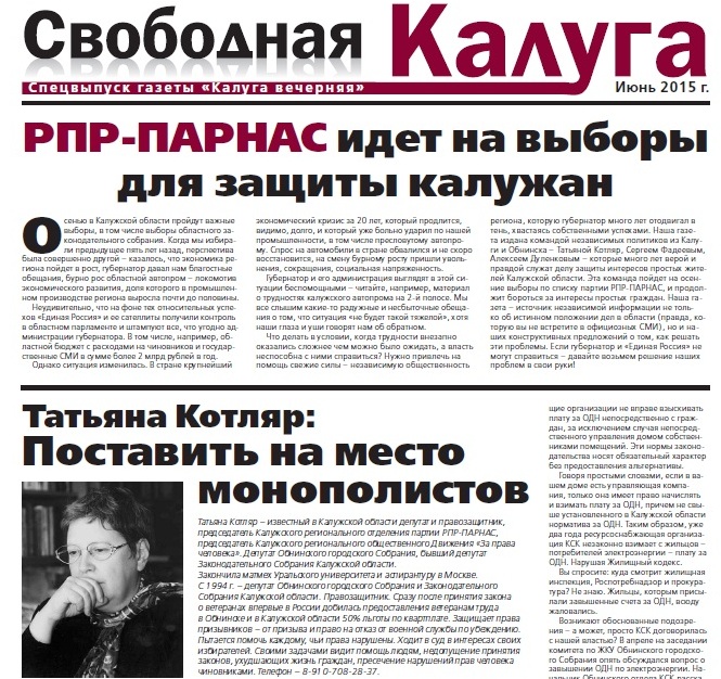 Демократическая коалиция, созданная недавно целым рядом оппозиционных партий, начинает активную агитационную кампанию в российских регионах. Сегодня Алексей Навальный опубликовал отчет о своей поездке в Новосибирск, а мы публикуем изданную нами совместно с партией РПР-Парнас агитационную газету, изданную тиражом в 150 тысяч экземпляров для жителей Калужской области. Наша газета представляет кандидатов в депутаты Калужского областного Законодательного собрания (в том числе и лидера "Демократического выбора" в Калуге Сергея Фадеева), а также простым и доступным языком рассказывает о ключевых проблемах, волнующих жителей области - от проблем калужского автопрома и сокращения расходов на здравоохранение и образование до борьбы с произволом энергетических монополистов и действий в связи с введением платы за капремонт жилых домов. Газета призывает калужан принять активное участие в предстоящих областных выборах, а также праймериз кандидатов Демократической коалиции.